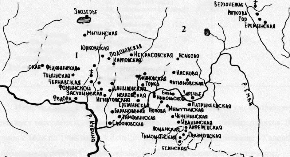 Предметом нашего исследования является Ембский Николаевский приход, границы которого совпадали с административными границами Ембской (в нек. источниках 19 века - Емской) волости Вельского, а с 1 января 1851 года Кадниковского уезда Вологодской губернии. Это была территория, удаленная от основных административных, экономических и культурных центров европейского Севера. По документам каркас расселения в долине реки Ембы сформировался к началу 17 века. * Никольский Погост как населенный пункт прекратил свое существование еще в начале XX века. ** Деревня Подгорное исчезла в 30-е годы XX века. *** Деревня Коротниха перестала существовать к 60-м годам XX века. (Н) Деревни, помеченные знаком (Н), в настоящее время относятся к Нижесо- лободскому сельсовету. Итак, мы видим, что к 1628 году на территории волости уже сформировался куст расселения, состоящий не менее, чем из 22 населенных пунктов. В период с 1628 по 1908 годы, т.е. за 280 лет в волости появились еще