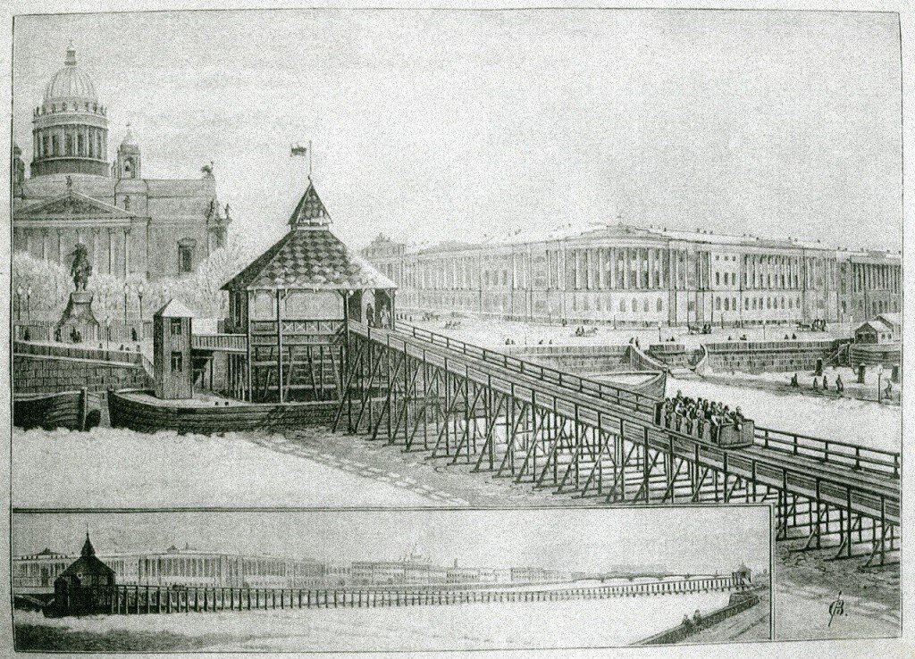 Суровые до чего зимы раньше были! Представьте, какие стояли морозы, чтобы лед так хорошо промерзал! В 1894 году Финляндское Общество лёгкого пароходства организовало в Петербурге рельсовый перекат пассажирских вагонов через Неву. Перекат работал от Сенатской площади на Васильевский остров и вначале это было неким аттракционом: вагоны под действием силы тяжести двигались по наклонно уложенным рельсам. Но уже через год на смену маленьким открытым вагонам пришёл настоящий трамвай на электрической тяге, который горожане сразу прозвали "ледовый трамвай" Этот трамвай приобрел огромную популярность и стал самым популярным транспортом в Петербурге того времени. Проезд стоил 3 копейки, что было доступно всем - да и в сравнении с санями, на которых петербуржцы обычно пересекали Неву, на трамвае это было и проще, и быстрее. "Ледовый трамвай" развивал скорость до 20 км\ч, и одновременно в него помещались 20 человек