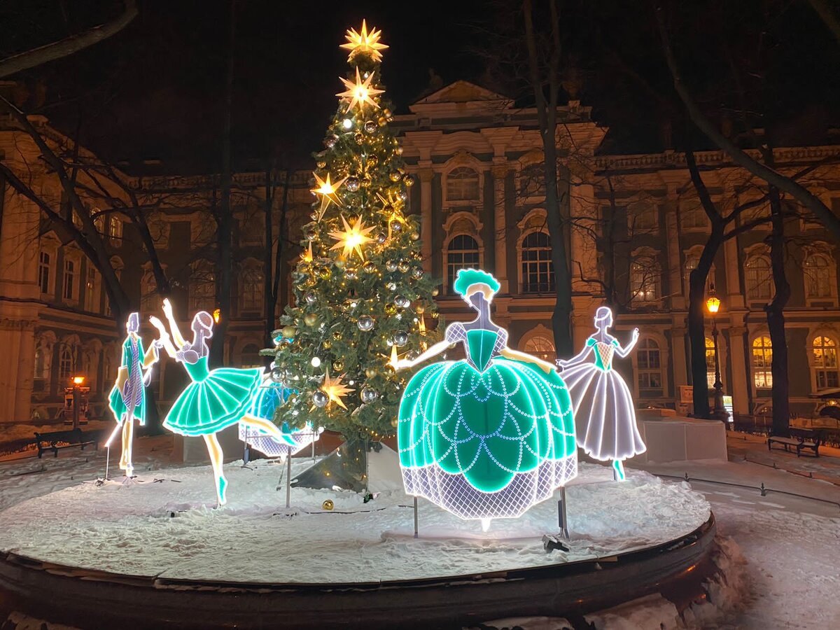 В последние годы в Петербурге появилась постоянная подсветка зданий в историческом центре, а к праздникам появляется дополнительная, праздничная иллюминация. Все это совершенно меняет облик ночного города. Раньше такого точно не было. Некоторые праздничные световые украшения не просто очень красивы, а вызывают восторг горожан, их фотографируют, снимают видео, размещают изображения и ролики в соцсетях и СМИ. Праздники заканчиваются … Поэтому, поспешим посмотреть наиболее запомнившиеся нам объекты. Первый из них – Большой парадный двор Зимнего дворца. Много повидал на своем веку этот двор – парадные выезды царствующих особ, ежедневный развод императорского караула. В 1896 году Николай II распорядился залить здесь каток и играл в этом дворе в хоккей. Первый век своего существования Большой двор было вымощен булыжником, в 1885 году здесь был разбит сад, пришедший со временем в запустение и восстановленный в 2003 году. Однако зимой, особенно вечером, двор выглядел серым, мрачным и унылым. И