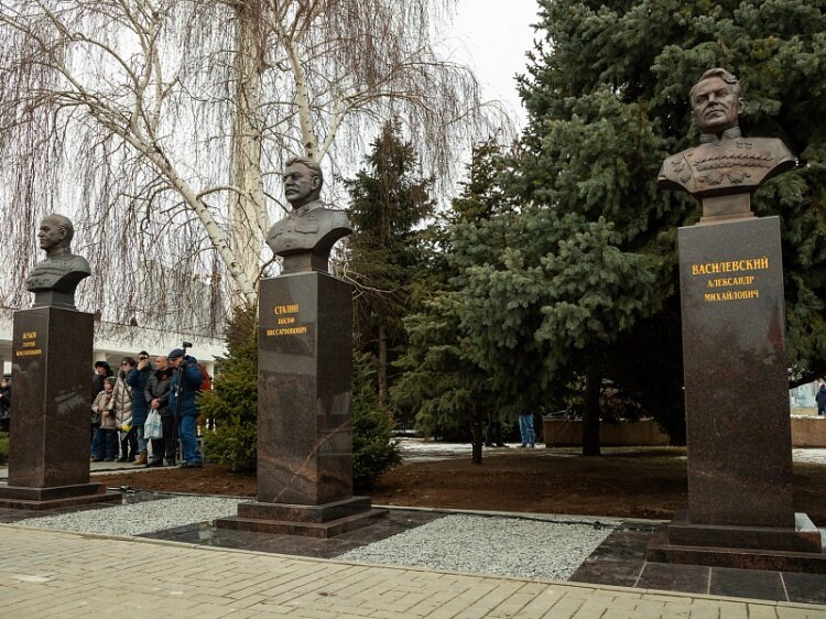 1 февраля в рамках празднования 80-летия Сталинградской битвы в Волгограде открыли памятники генералиссимусу Иосифу Сталину, маршалам Георгию Жукову и Александру Василевскому. Они расположились около музея-панорамы «Сталинградская битва». Как рассказали Волжский.ру в пресс-службе региональной администрации, монументы из бронзы на гранитных постаментах изготовил волжанин, заслуженный художник России Сергей Щербаков. Для создания эскизов и бюстов он использовал архивные фотографии: генералиссимус и маршалы изображены в парадной форме с медалями и орденами.