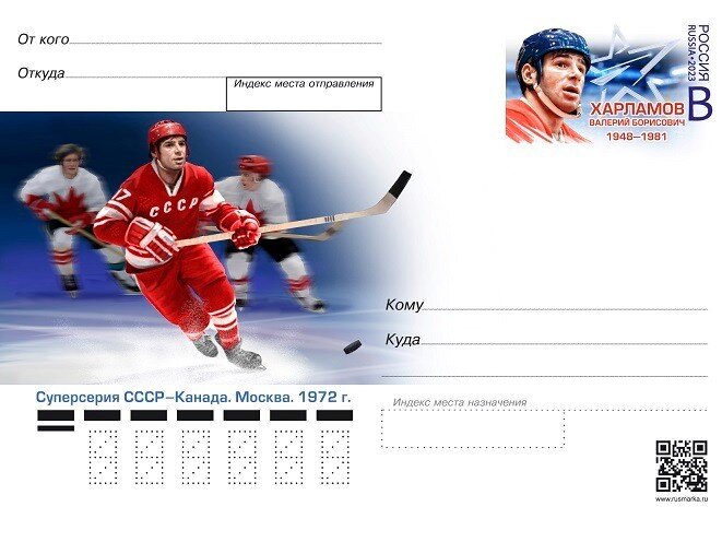 31 января в почтовое обращение вышла карточка с оригинальной маркой, посвящённая 75-летию со дня рождения двукратного олимпийского чемпиона, восьмикратного чемпиона мира Валерия Харламова. На оригинальной марке изображен портрет легендарного мастера; на основном изображении — фрагмент матча Суперсерии СССР – Канада 1972 года в Москве. Дополнительно к выпуску карточки с оригинальной маркой изготовлен штемпель специального гашения для Москвы. Дизайн (марка): Федерация хоккея России.