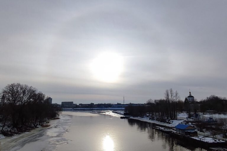 Гало можно было увидеть на прошлой неделе. Днём 26 января жители Твери могли наблюдать достаточно редкое природное явление — яркий ореол вокруг солнца, называемый гало. Это оптическое явление, создаётся ледяными кристаллами в верхних слоях атмосферы, в которых получается дисперсия света. Для того чтобы гало образовалось в небе, нужно, чтобы совпали все необходимые условия. Это минимальная облачность или же её полное отсутствие, низкая температура воздуха и уровень влажности, позволяющие появиться необходимым для преломления света кристаллам. Всего насчитывается около сотни разнообразных видов гало. Этот вид гало, наблюдаемый 26 января — паргелический круг. Это круг, совершенно лишен радужной окраски, имеет чистый белый цвет. Иногда вместе с ним наблюдаются и столбы. В таких случаях около светила образуется крест, что часто вызывает суеверные представления об этом явлении. Фото: Екатерина Афанасьева. Подпишись на Telegram-канал «Твериград. Главные новости Твери!»: это только самые важны