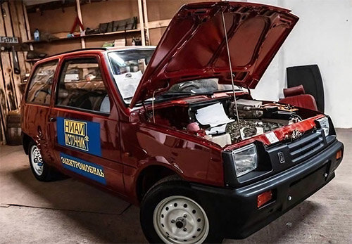 Вместо штатного мотора в Оке установлен электромотор ПТ-125 мощностью 34 л.с. С ним авто может разогнаться до 90 км/ч. Комбинация приборов своя, с парой вольтметров вместо указателей уровня бензина и температуры антифриза.