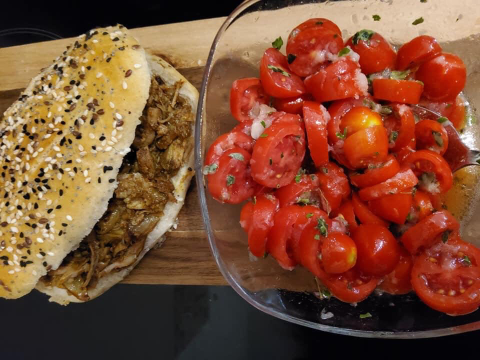 Вот такой у нас сегодня обед🤩 Булочка с домашней шаурмой и салат из помидоров с чесноком и орегано. Для салата просто нарежем кольцами помидоры, чеснок очень мелко нарубим. Посыпем овощи зеленью орегано. Заправка: оливковое масло, лимонный сок, капля мёда, чёрный молотый перец, соль. Запечем в духовке в фольге обмазанный специями кусок индейки (бедро). Маринад: оливковое масло, сладкая паприка, немного острого красного перца, черный перец, соль, порошок карри, рас-аль-ханут (при наличии), чесночный порошок. Хорошо помассируем мясо, обернём фольгой, запекаем при 200 градусах час-полтора. Нв оливковом масле обжарим нарезанный полукольцами жареный лук. Добавим нарезанное на тонкие ломтики запечённое мясо и мясной сок, полученный при запекании. Готовим ещё две минуты, и наше блюдо готово - можно сервировать. Это очень вкусно! Приятного аппетита 😋