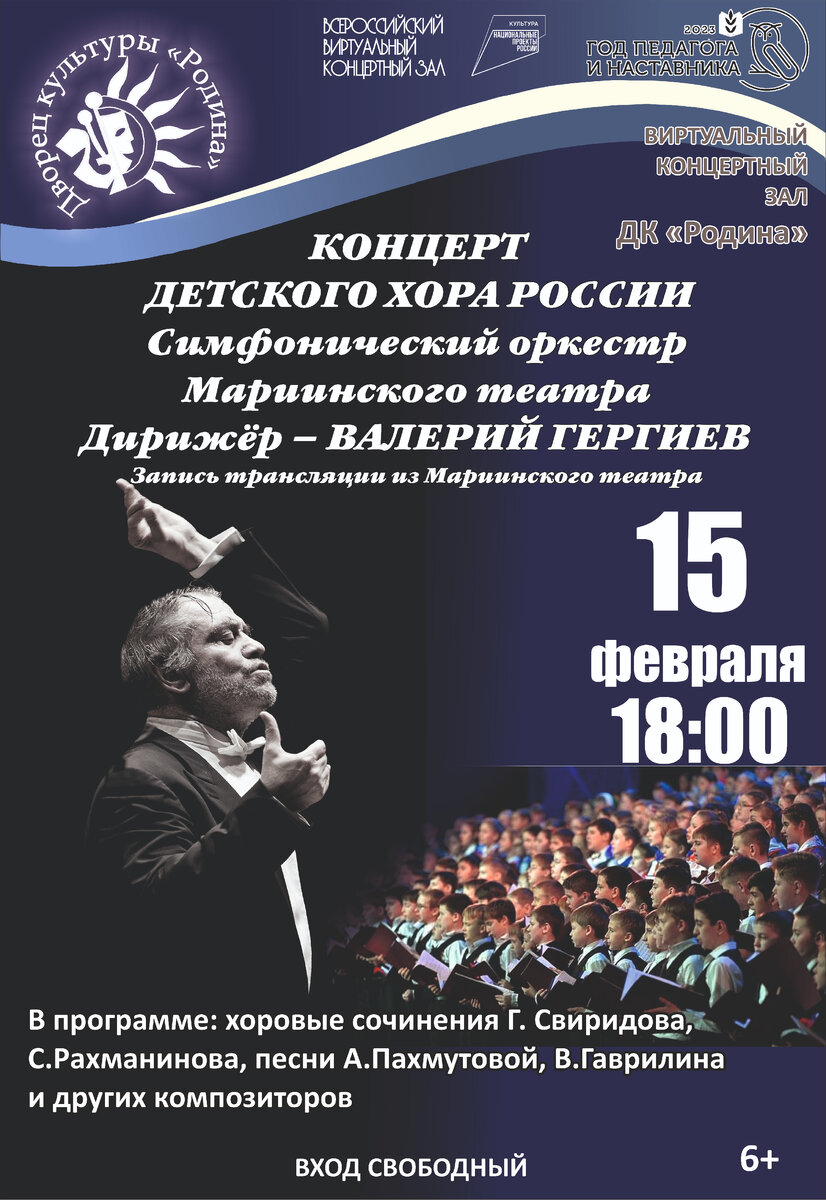 Валерий Гергиев: «Сейчас нам нужно снова ощутить себя как поющую страну». 15 февраля в 18:00 виртуальный концертный зал ДК «Родина» представляет концерт уникального коллектива - Детского хора России! В Детском хоре России поёт тысяча ребят со всей страны в возрасте от 9 до 14 лет. Аккомпанирует хору симфонический оркестр Мариинского театра под руководством маэстро Валерия Гергиева. Валерий Гергиев в 2013 году стал инициатором возрождения Всероссийского хорового общества. Уже в 2014 году участники общества воплотили идею создания Детского хора России. Одаренных детей искали по всей стране. Тысячный хор объединил детей из 84 регионов России. Юные солисты проходили серьезный конкурс — учитывались не только их вокальные данные, но и знания по теории музыки, сольфеджио, умение в сжатые сроки осваивать объемный музыкальный материал. Собрать тысячный хор со всей России на многочисленные репетиции было практически невозможно. Поэтому коллектив разделили на 87 групп — каждая занималась отдельно