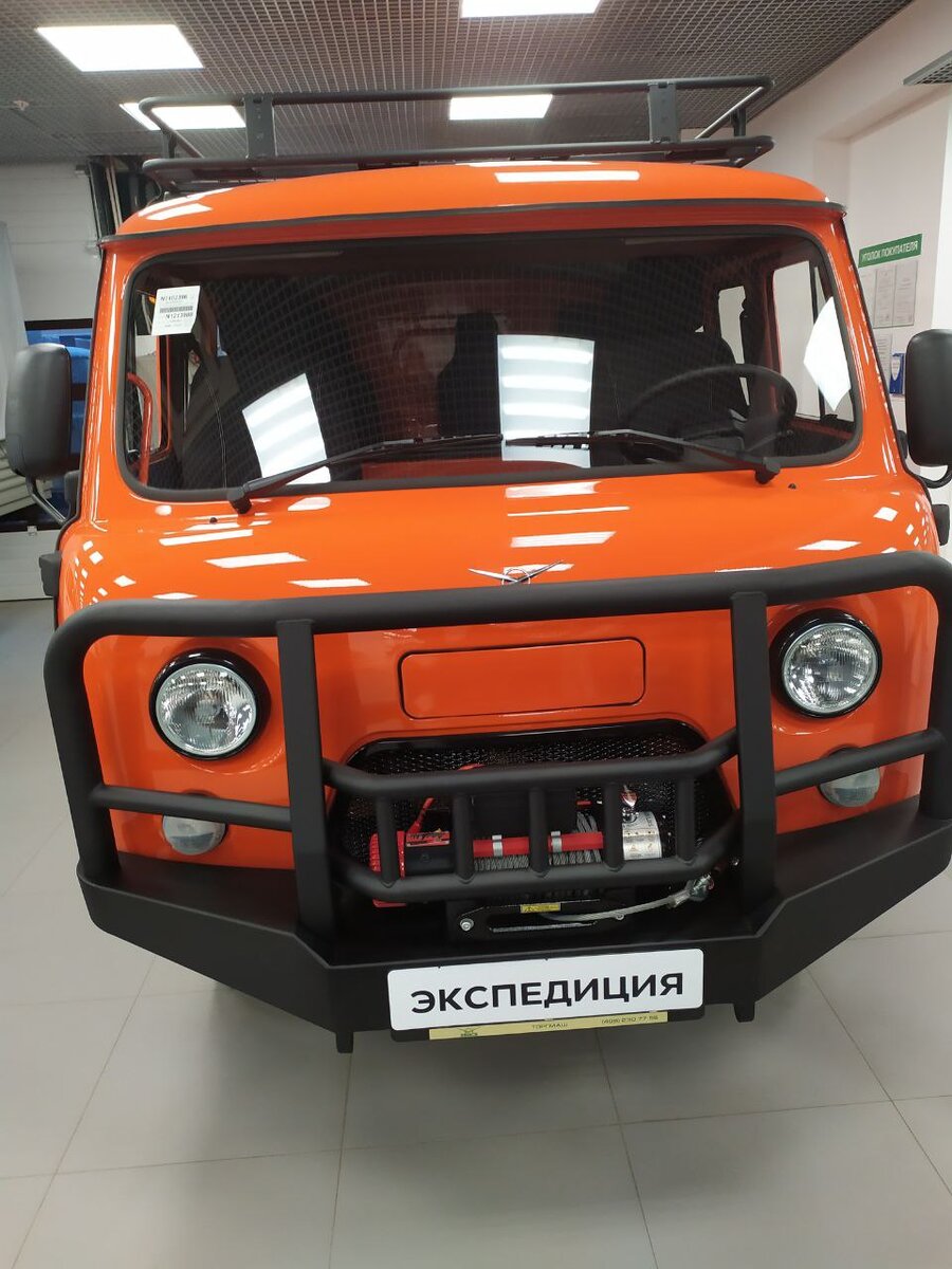 Спецсерия УАЗ Комби Экспедиция разработана на базе 7-местного УАЗ Комби Трофи и обладает повышенным набором внедорожных характеристик и функциональных деталей. Без сомнения, с этим автомобилем ваши поездки по бездорожью станут намного комфортнее и безопаснее благодаря наличию подключаемого полного привода Part-Time, мостам «Спайсер», подвеске мостов на рессорах с заделкой на оси и стабилизатору в передней подвеске. Блокировка дифференциала заднего моста гарантирует повышенную проходимость. По кнопке в салоне устанавливается жесткая связь между колесами одной оси, что исключает остановку одного ведущего колеса, когда второе буксует. Внешне это тот же самый УАЗ Комби Трофи, но ярко-оранжевого цвета, с экспедиционным багажником на крыше и передним силовым бампером с кенгурином и площадкой под лебедку. В ТОРГМАШ, по желанию, вы можете выбрать экспедиционный УАЗ Комби и в защитном цвете. На авто представлены штампованные диски черного цвета 16`` ET 40 с черными колпаками. Шины BF Goodric