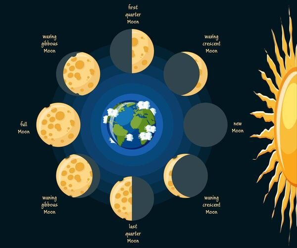 Фазы Луны обусловлены тем, что Луна вращается вокруг Земли и, в зависимости от ее положения, определенная часть ее поверхности отражает свет в направлении нашей планеты. Существует четыре лунные фазы: Растущий полумесяц, полнолуние, убывающий полумесяц и новолуние. Полный цикл лунной фазы длится около 29 дней и 12 часов, что короче среднего месяца.