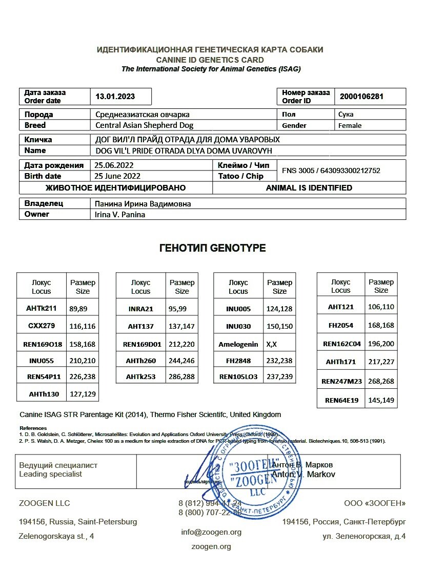 Сравнительно недавно появилась возможность у широкого круга собаководов проводить генетическую идентификацию собак. Для чего это может быть нужно - для установления родства, даже не обязательно в первом поколении, иногда вопросы вызывают и внуки производителей и правнуки. Так как система регистрации собак не совершенная и пока имеются в любой организации, регистрирующей пометы собак не совсем честные люди, то к сожалению могут быть разные неожиданности. Сразу скажу, с таким лично сталкивалась дважды, обнаружив приписанного щенка своему производителю. Это были две разные организации. В обоих случаях пометы были аннулированы. Поэтому сейчас предпочитаю подстраховывать своих производителей и таким образом. Для чего может еще пригодится ген.паспорт - бывают вязки с двумя производителями, они официально разрешены и в таком случае возникнет вопрос в оформлении щенков. Зачем вообще таки вязки? Бывают случаи, когда у производительницы последняя вязка и рисковать пустовкой точно не хочется, д