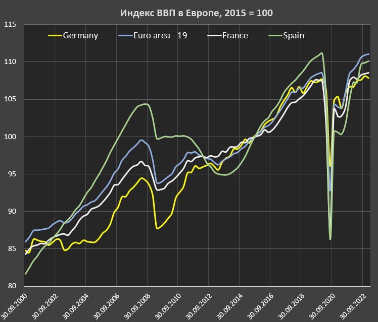 Несмотря на все вышеуказанные шоки, с декабря 2019 по 4 кв 2022 экономика стран ЕС выросла на внушительные 2.9%, полностью преодолев провал 2020. Экономика стран Еврозоны выросла на 2.4%, в Германии символический рост на 0.2%, во Франции прирост экономики на 1.2%, в Испании незначительное падение на 0.9%.