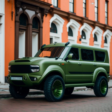 Внешний вид УАЗа окрашен в яркий хакерский зеленый цвет, отражающий смелый и инновационный дух . Угловатые линии и острые грани автомобиля придают ему футуристический вид, который отличает его от традиционных военных автомобилей. Цвет и дизайн призваны навеять мысли о бунтарстве и несоответствии, ключевых темах жанра милитари.