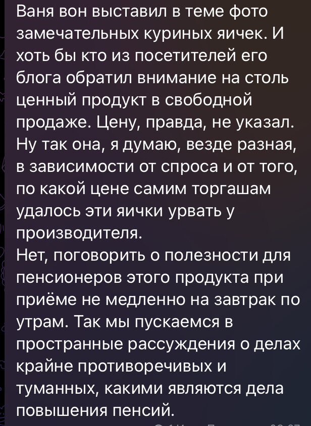 Жена яйца продает по 80 рублей (десяток) из-под наседки. /От товарища Николая/ Яйца, конечно, от домашних курей лучшие. Как знаток говорю. Обычно после посещения родной деревни автор возвращается с ведром бесплатных куриных яиц. Это деревенские родственники насильно всовывают, считая, что мы в городах неправильно и не тем питаемся. Товарищ Александр в моём дневнике в ветеранской теме написал: Поговорим о яйцах и полезности для военных пенсионеров... Яйца - они такие. Очень полезные для здоровья и вкусные в употреблении. Автор употребляет их в русских бутербродах: Тостовый хлеб через тостер, алтайский сыр с укропом и. И кофе из кофеварки автомата с молоком. Вместо сахара - ложку мёда. Александр про цену яиц вспомнил. У нас в Новосибирске такие цены: Скажем так, подъемные цены для разных кошельков. А вот, по словам Александра, у них в Приморье на Дальнем Востоке: Цена на куриные яички прямо-таки по сравнению с вашими, грабительские в магазинах - 112 р за десяток. В моем детстве помню,
