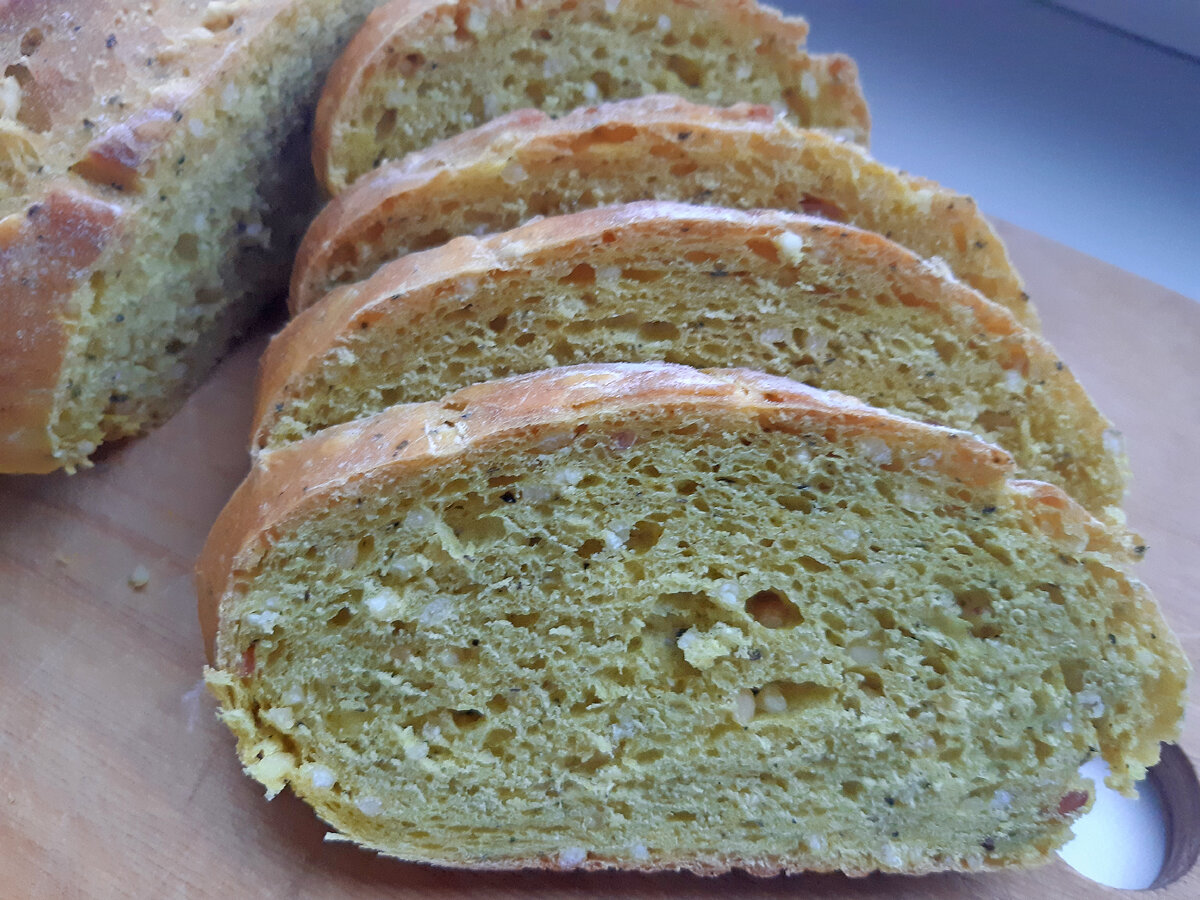 1ч. л куркумы. Рис хорошо промыть, подсушить бумажным полотенцем и немного пожарить на сковороде. Замесить тесто, поставить его подходить в духовку с включенной лампочкой на час. Обмять. Сформовать батоны. Надрезать. И дать им расстояться под салфеткой минут 20–30. Выпекать при температуре 180° с кипятком: посуду с горячей водой поставить на дно духовки. Убрать за пять минут до окончания выпечки. Общее время в духовке – 25–30 минут. Готовые батоны накрыть салфеткой, дать им остыть и можно нарезать. Вместо резюме Запах базилика на всю квартиру! При нарезке чувствуется сильнее. Как, впрочем, и куркума. Мякиш влажный, крупа не хрустит, привкус риса ощу