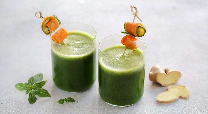 Витаминный коктейль из овощных соков — вкусный и несложный способ добавить полезные микронутриенты в свой рацион. В моркови много витамина A и Е — они невероятно полезны для красоты кожи. Имбирь поможет поддержать иммунитет и защитные функции организма, это особенно важно в межсезонье, когда бушуют вирусы и непредсказуемо ведет себя погода. В огурцах в основном вода, но они тоже весьма полезны за счет содержания клетчатки и калия. Сердечно-сосудистая система скажет вам отдельное спасибо за такую заботу. Плюс овощные соки — это просто очень вкусно. Бодрит и освежает в любую погоду и время суток ИНГРЕДИЕНТЫ Из овощей и имбиря выжмите сок. Петрушку мелко нарежьте и измельчите блендером в пюре, при необходимости добавьте немного воды. Смешайте соки и пюре из петрушки. По желанию разбавьте коктейль водой и разлейте по стаканам.