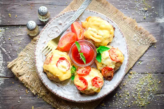 Сегодня я хочу вам предложить приготовить очень вкусные котлеты, которые получаются необыкновенными. Приготовим блюдо по-особенному – поверх котлет сделаем небольшую «шапочку» из помидоров и сыра, добавим немного майонеза. Готовые котлеты выходят сочными и ароматными, такие котлеты заслуживают стоять даже на праздничном столе. Из фарша можно много чего приготовить, но классикой все же остаются любимые рецепты из детства. К чему можно подавать такое блюдо – абсолютно ко всему – салаты, овощи, крупы, картофель и т.д. Что же, если вы немного заинтересованы, тогда отправимся на кухню. Для приготовления котлет Вам понадобится: Шаг 1. Подготовить все необходимые ингредиенты по списку. Взять глубокую миску и переложить в нее готовый фарш, который в своем составе содержит исключительно мясо – половина свинины, половина говядины. Добавить в фарш чеснок – предварительно зубки натереть на терке. Лук очистить и сполоснуть, нашинковать мелко и бросить в миску с фаршем. Всыпать немного соли и молот