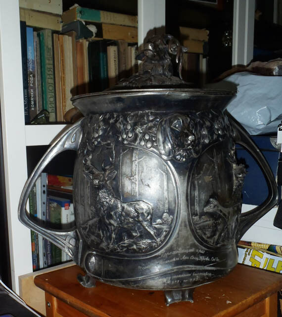 Давно уже мы мечтали приобрести какую-то старинную и красивую вещь, статуэтку в виде охотничьей собаки или охотничий кубок, для того, чтобы учредить переходящий приз нашей секции. Очень уж надоели безвкусные блестящие жестяные кубки, изготавливаемые в Китае... Но хорошая вещь, все не подворачивалась - у нас в стране они не находились, а на импортных аукционах при умеренной цене совершенно зашкаливала стоимость доставки.