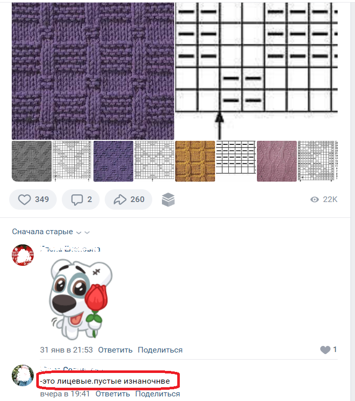 Просматривая новостную ленту в ВКонтакте, наткнулась на пост со схемами к простым узорам... Пост, как пост - несколько образцов со схемами... Я люблю такие рисунки, образованные простым чередование лицевых и изнаночных петель... И всё бы ничего, если бы не комментарий под постом. А в комментарии, пользователь, видимо, даёт разъяснение по условным обозначениям. НЕ ПРАВИЛЬНОЕ разъяснение))) Друзья, чтобы понять, какие значки, что обозначают на схеме, нужно внимательно рассмотреть фото узора. Кроме того, неплохо бы было знать общепринятые обозначения. Например, Рассматривая фотографию узора, можно увидеть последовательность выполнения рисунка. В данном узоре хорошо видны лицевая гладь и платочная вязка. Да! Платочная вязка внешне похожа на обратную сторону лицевой вязки, т.е. на изнаночную гладь. Но, она другая - более рельефная на внешний вид и более плотная, если можно так сказать - более толстая, по ощущениям. Лицевая гладь образуется чередованием рядов лицевых и изнаночных петель.
