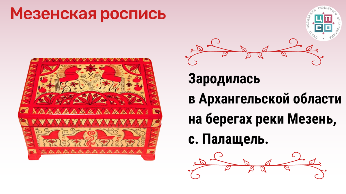Россия издревле славится мастеровыми с золотыми руками. Декоративно-прикладной промысел зародился ещё много веков назад. Некоторые направления популярны по сей день. В том числе художественная роспись. Какие-то виды узнаваемы, какие-то скоро канут в лету вместе с секретами старых мастеров. Ребята, которые получают образование на семейном обучении, глубже и ближе познают тайные послания умельцев прошлых веков. Дети изучают причудливые рисунки на уроках мировой художественной культуры и ИЗО. Мезенская роспись Второе название Палащельская. Занимались украшением предметов быта только мужчины и передавали секреты мастерства из поколения в поколение. Орнаменты наносили на древесину перьями тетерева, глухаря или же маленькими деревянными палочками. Каждый завиток, каждый мазок имел особое значение. Красные кони, например, олицетворяли солнце. Федоскинская лаковая миниатюра В 1795 году московский купец Пётр Коробов основал небольшую фабрику по производству лакированных козырьков для военных.