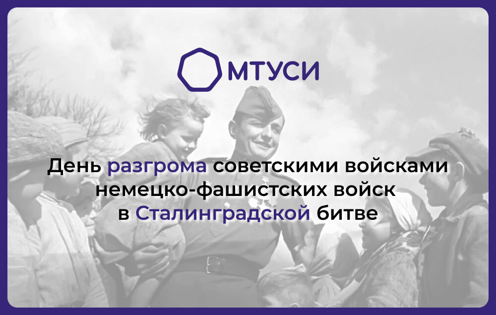 2 февраля 1943 года завершилась Сталинградская битва. Этот день был установлен 13 марта 1995 года в соответствии с Федеральным законом «О днях воинской славы и памятных датах России». Ожесточенные бои велись на протяжении 200 дней, с 17 июля 1942 года по 19 ноября 1942 года, а сама битва была поделена на 2 периода: оборонительный и наступательный. Целью вражеского командования было нарушить коммуникацию города с центром страны и завладеть нефтяными и сельскохозяйственными районами, разгромив советские войска. Тяжелые, кровопролитные бои шли круглосуточно. Солдаты воевали за каждую улицу, переулок и каждый дом. Несмотря на все усилия советских войск, немецким войскам всё же удалось прорваться к Сталинградскому тракторному заводу. Однако, уже 11 ноября 1942 года враг предпринял последнюю попытку овладеть городом и уже 18 ноября вынужденно перешёл к обороне, провалив план по захвату Сталинграда. Свой вклад в Победу внесли студенты, преподаватели и выпускники МТУСИ – в ту пору он назыв