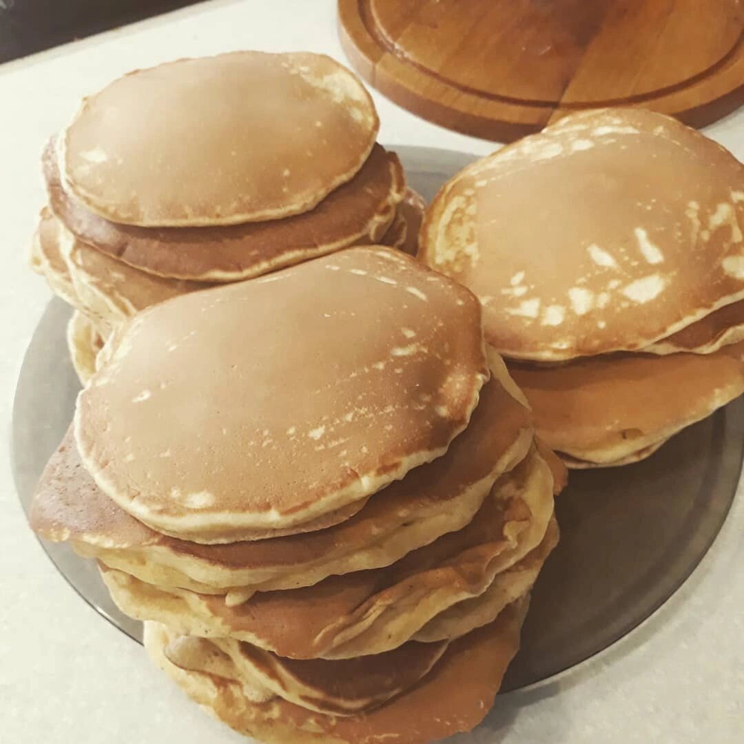Панкейк (с англ. «pan» — сковорода, «cake» — пирожное) — кулинарное изделие, представляющее собой толстый пышный блинчик, по вкусу напоминающий бисквитный корж. Панкейки — это традиционное блюдо Северной Америки, популярное как в США, так и в Канаде. В этих странах панкейки являются неотъемлемой частью завтрака, но и жители других континентов давно оценили их по достоинству — сегодня эта вкусная выпечка входит в меню кафе и ресторанов по всему миру. Панкейки на закваске: • 170 г пшеничной закваски 100% влажности • 100 г сахара • 200 г молока • 330 г муки • 4 ст.л.растительного масла • 4 шт яйца • 1 ч.л. соды • 1 ст.л. воды (кипяток) • щепотка соль Все ингредиенты должны быть комнатной температуры. Смешать яйца с сахаром и солью, взбить венчиком. Добавить молоко и остатки закваски, еще раз перемешать. Добавить муку и перемешать до однородности. Соду развести в кипятке и влить в тесто. Используйте именно соду, а не разрыхлитель. Сода нейтрализует лишнюю кислоту в закваске