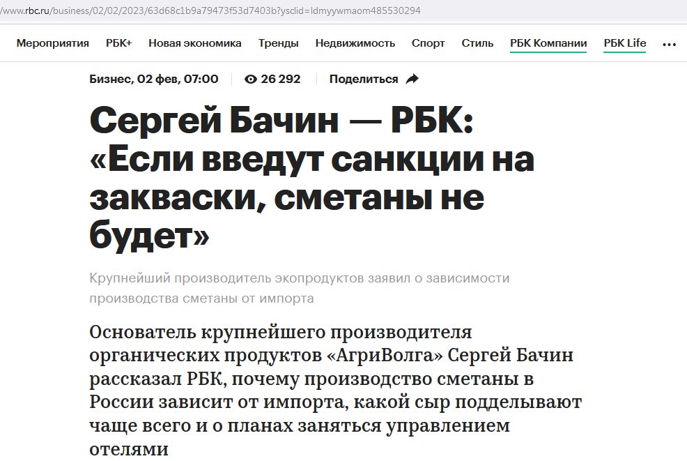 Основатель крупного сельскохозяйственного холдинга Сергей Бачин рассказал РБК, что Россия имеет критическую зависимость от импорта молочных заквасок.