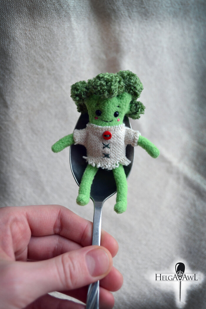 Или о чем мечтает вегетарианец. Ох, уж эти миниатюрные создания, которых некоторые люди обожают со всей силы, а другие силятся сшить:) Решила сегодня показать малыша Брокколи. Этот овощ так знаком всем, но не всеми любим. Вегетарианцы могут просто умиляться от созерцания, ну а тем, кому капуста не по душе, тот может думать, что это один из мирно живущих на Земле инопланетян. Сшит в виде броши вручную из флиса и еще некой ткани, набит холлофайбером, глазки и пуговка пластиковые. Читайте также.
