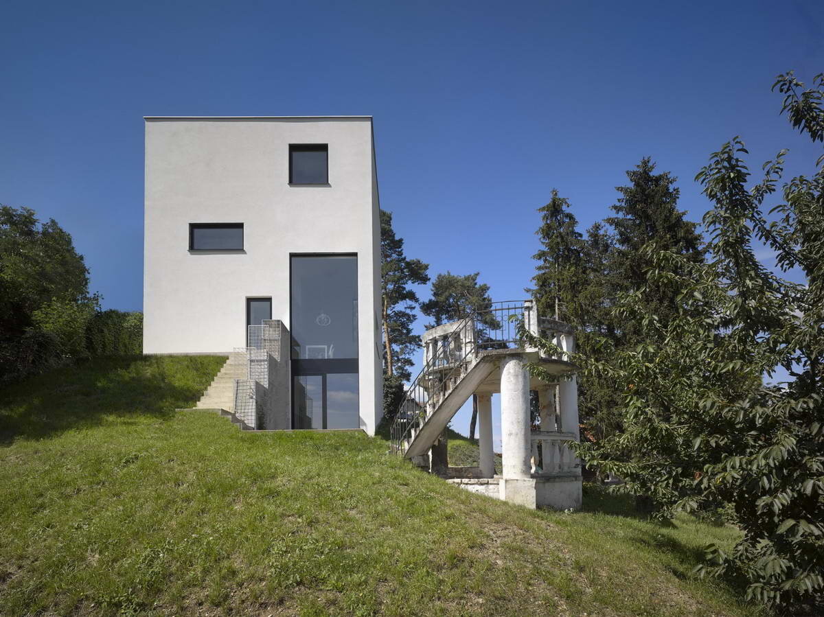 Трезвый по своей простоте, благородный в материальной чистоте, элегантный в простой форме и изысканный в интерьере, этот дом расположен на крутом склоне с видом на коммуну в долине Бероунка внизу и горы вдали. Оригинальный сад романтической виллы в исторической части Вшенира очаровал архитекторов и владельца не только прекрасными видами и драматическим ландшафтом, но и остатком оригинальной конструкции — романтической круглой беседкой с винтовой лестницей. При этом концепция дома была совершенно противоположна: строгая прямоугольная геометрия с белым дизайном интерьера. В результате получился минималистский дом-башня с входом сверху и четырьмя уровнями, включая двухсветную гостиную. Благодаря компактному объему удалось добиться пассивного стандарта. В доме есть несущая конструкция из бетонных блоков и железобетонных потолков. Фасад представляет собой контактную изоляцию с мелкозернистой белой штукатуркой и алюминиевыми окнами. Название: Дом-башня (Tower House)