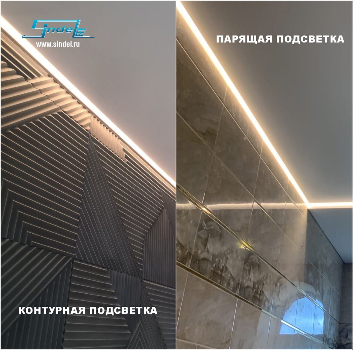 Существует несколько технических вариантов парящей подсветки, выполняемых разными профилями, различный фирм производителей. Различия между ними лишь в ширине зазора между натяжным потолком и стеной ( от 15 до 24мм ) .