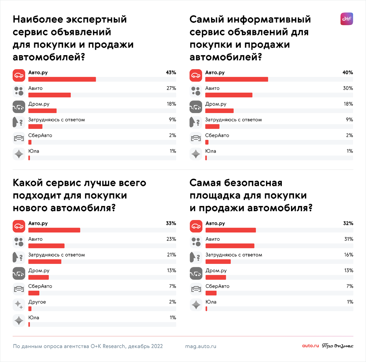 Самой безопасной площадкой для выбора, покупки и продажи автомобилей россияне считают Авто.ру. Такой вывод получили эксперты исследовательского агентства O+K Research в ходе проведённого в конце 2022 года опроса. Кроме того, по мнению большинства участников опроса (33%), Авто.ру — наиболее подходящая площадка для покупки новых машин. 40 процентов респондентов считают Авто.ру наиболее экспертным сервисом на российском авторынке, на котором можно получить наибольшее количество полезной информации по автомобильной тематике. *** С уважением, Ваш независимый автоэксперт Дмитрий Демидов 🚗