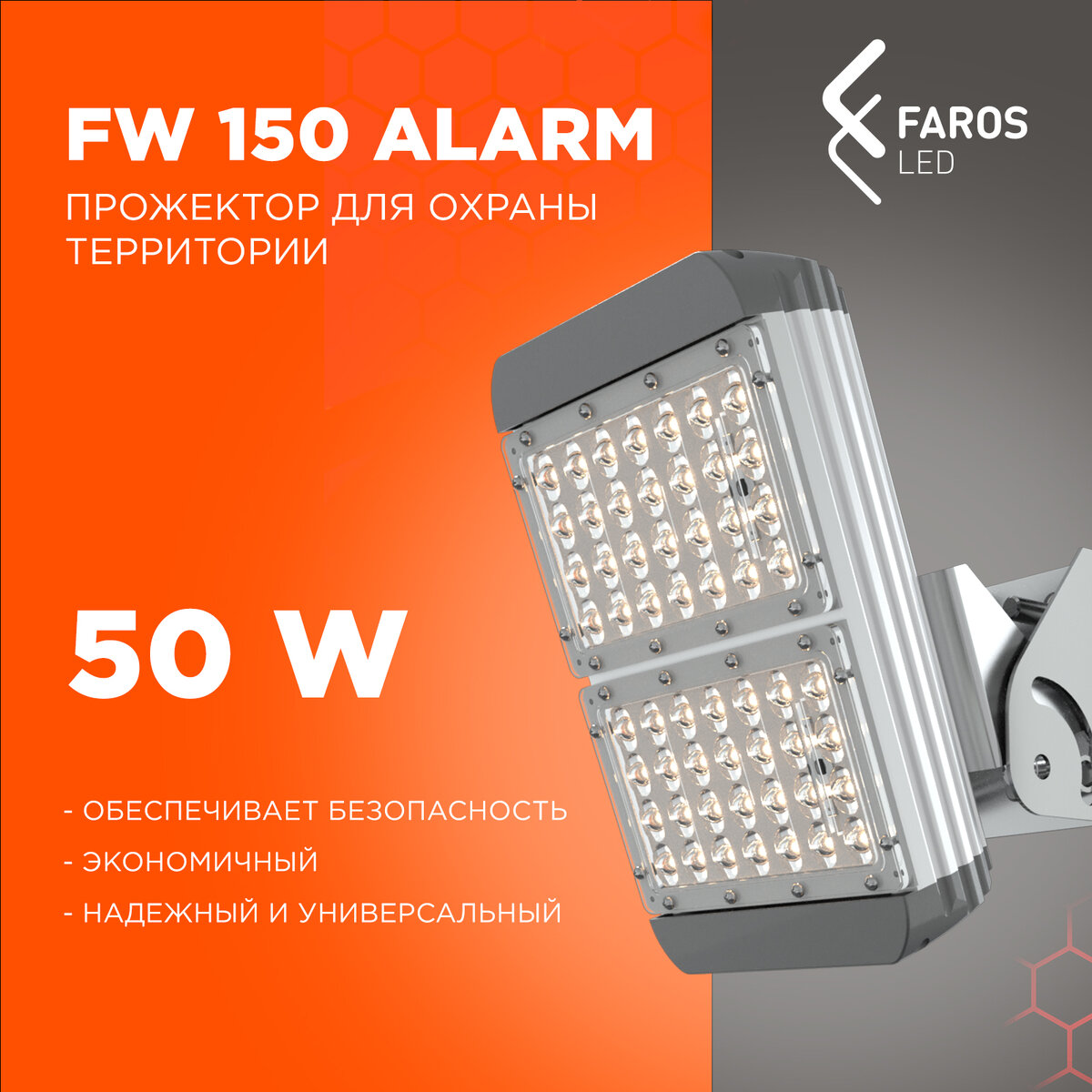 FW 150 Alarm – это популярный светильник бренда FAROS LED для наружного освещения в алюминиевом корпусе, оснащенный режимом охраны. Он очень экономичен и предназначен для освещения периметра промышленных и складских объектов в режиме охраны и вне рабочего времени, а также для общего освещения открытых пространств, например, парковок. Режим охраны в данных светильниках позволяет обеспечивать безопасность и предотвращать несанкционированное проникновение на охраняемую территорию. Светильник работает в двух режимах: дежурный и тревожный. Дежурный режим. Этот режим начинает работать после выключения основного света и завершения рабочего дня. Он предназначен для того, чтобы службы охраны могли контролировать ситуацию по периметру территории, создать оптимальные условия для работы систем видеонаблюдения. Кроме того, такой режим освещения служит сдерживающим фактором, предотвращающим проникновение злоумышленников. В дежурном режиме FW 150 Alarm имеет минимальную нагрузку светильника - 15 Вт,