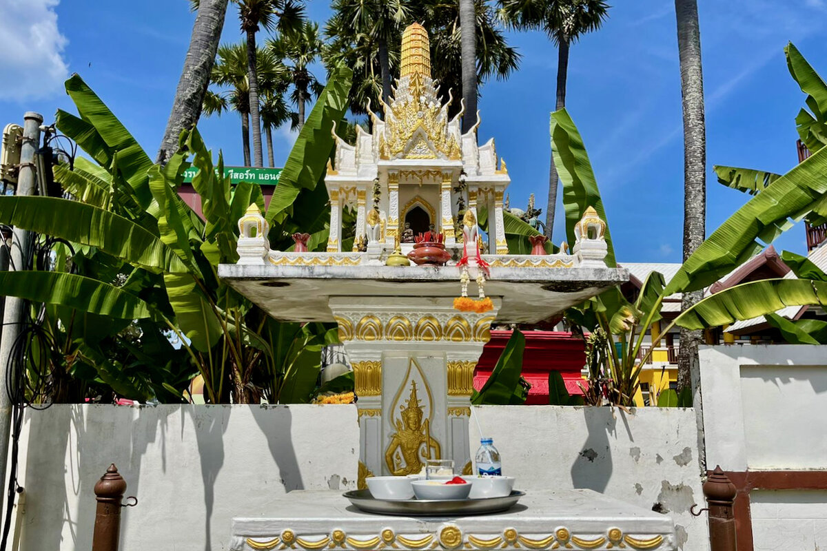 Домики эти называются санпрапум, и они в Таиланде везде – даже перед зданиями правительственных учреждений. Тайцы заботятся об этих домиках – прибираются там, украшают цветами и гирляндами, оставляют свежую еду, зажигают благовония. Есть даже правила, по которым надо строить санпрапум: