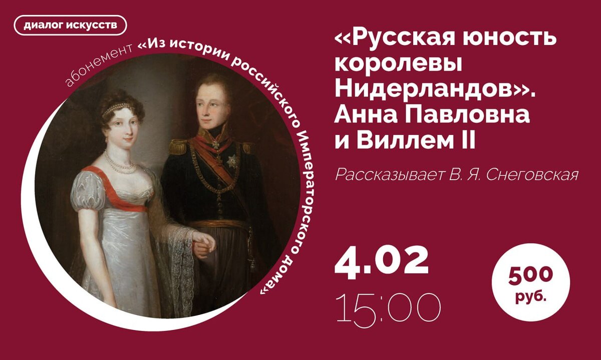 Встреча на экспозиции Главного штаба. → Билеты на сайте Лектор Виктория Яковлевна Снеговская — искусствовед, специалист по западноевропейскому искусству. О чем мы расскажем Эта встреча посвящена необычной судьбе младшей дочери императора Павла I, великой княжны Анны. Анна Павловна — праправнучка Петра Великого, русская принцесса, ставшая супругой короля Нидерландов, героя битвы при Ватерлоо, Виллема II. Она изучала язык и традиции Голландии, активно занималась благотворительностью и стала королевой, любимой всеми своими подданными, «истинной матерью всех бедных детей в королевстве». Жизнь Анны Павловны в Нидерландах широко освещена в исторической литературе, правлению королевской четы и их художественной коллекции были посвящены большие выставки. Почитание «прирожденной королевы» в Голландии отражено в названии одного из городов — Анна Полона, а один из ее потомков, Виллем Александр, сегодня является королем Нидерландов. Детство и юность великой княжны привлекали меньше вним