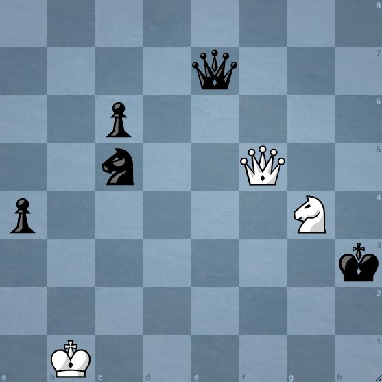 Собственно все написал в заголовке, теперь собственно к этюду: +: Вариантов развития немного - там или мат сразу королю черных или выигрыш ферзя, но есть одна линия позволяющая черным продержаться до такого положения: Ход белых, выигрыш: Тут всего один ход все решает...