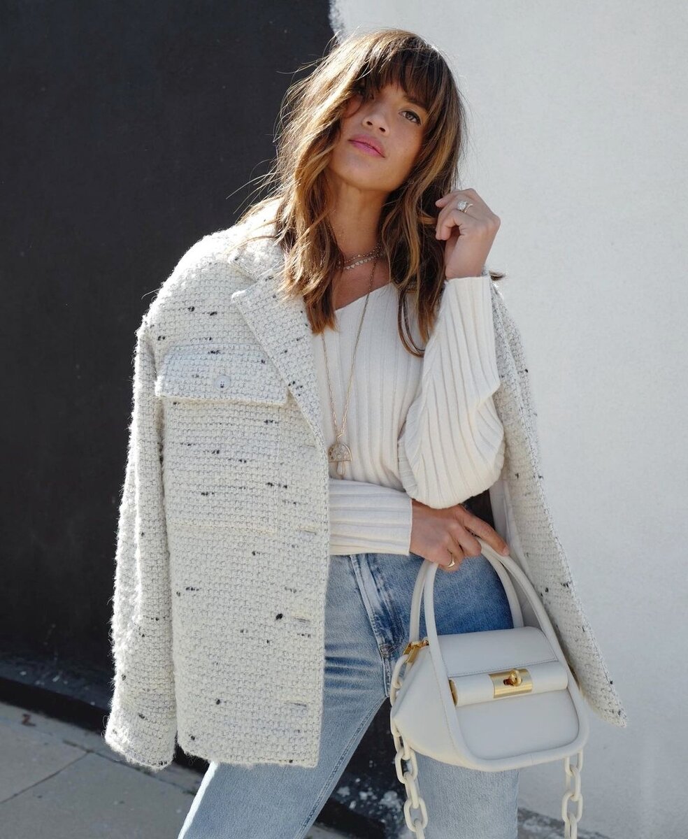 Для деловых и рабочих встреч прекрасно подойдет жакет, дополненный металлическими пуговицами, а вот для повседневных образов нет ничего лучше новинок года — это твидовые пиджаки в стиле оверсайз. Они могут быть как двубортными, так и однобортными, иметь элементы дизайна в виде накладные карманов. Красиво будет смотреться твидовый жакет в мелкую клетку или «гусиную лапку».