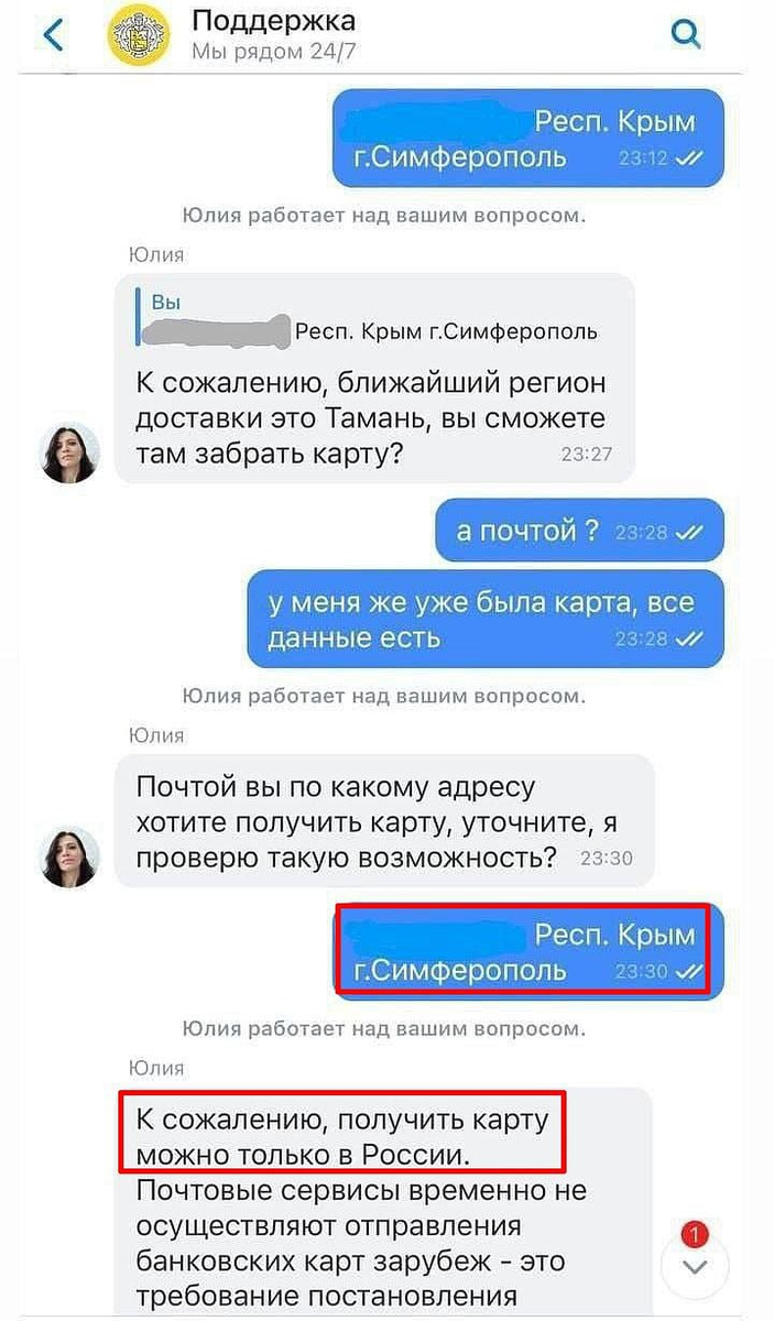 Сейчас разворачивается серьезная дискуссия относительно отказа сотрудника Тинькофф Банка отправить карту жителю Крыма, ссылаясь на то, что Крым это не Россия. Переписка взята из открытых источников. Странно, что до сих пор не получен ответ от самого банка. Я его, к сожалению, не видел до сих пор, а ведь по укроканалам в телеграм это сообщение начало поститься примерно с утра. По всей видимости, дело было вчера вечером, но тут точной информации нет. Все начали это связывать с тем как сам Олег Тиньков отозвался о происходящем находясь в Лондоне - тогда многие начали выкидывать и ломать карточки банка, но сам банк сообщил, что к этому отношения не имеет. Не исключаю, что сотрудник попросту не знает где находится Крым и о том, что этот полуостров является частью нашей страны. С географией и устройством государства, его субъектами многие не знакомы. Помню, у меня была сотрудница которую я отправлял в командировку в Татарстан и она отправилась узнавать как получить визу :). Поэтому, думаю,
