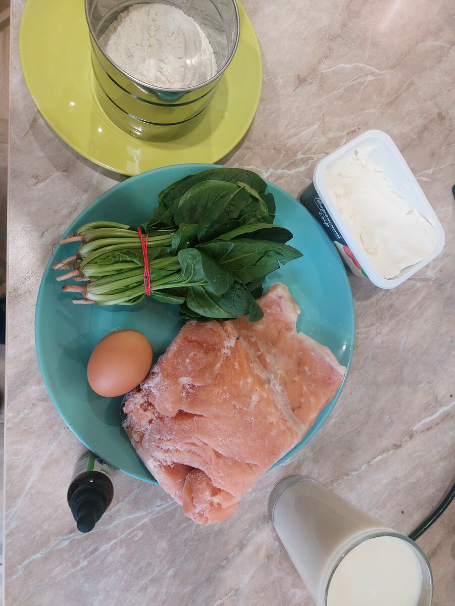 Стейк красной рыбы Пучок шпината и укропа 0,5 молока 3 - 4 капли сах.зама Яйцо Рисовая мука - стакан Творожный сыр - 400гр 1 2 3 4 5 Всем приятного аппетита