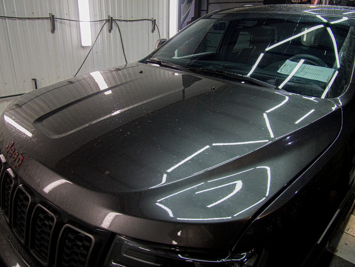 Одной из отличительных черт комплектации Trailhawk на Jeep Grand Cherokee WK2 является матовая наклейка на капоте. После покраски или замены капота для восстановления заводского вида необходимо нанести наклейку под оригинальным номером 82215008 Загоняем автомобиль на пост детейлинга Далее очищаем капот, чтобы ни одной пылинки не оказалось под наклейкой Снимаем защитную пленку с наклейки, на клеевой слой наносим мыльный раствор, чтобы пленка скользила по капоту, пока мы правильно ее расположим. После того как правильно расположили наклейку, специальным пластиковым шпателем выгоняем из-под пленки воздух и лишнюю воду. После снимаем белую защитную пленку и опять разглаживаем на капоте Получаем вот такой внешний вид автомобиля, как и задумано заводом изготовителем. Заказать и приклеить такую же наклейку всегда можно в Территории Джип +79251001001 tjeep.ru