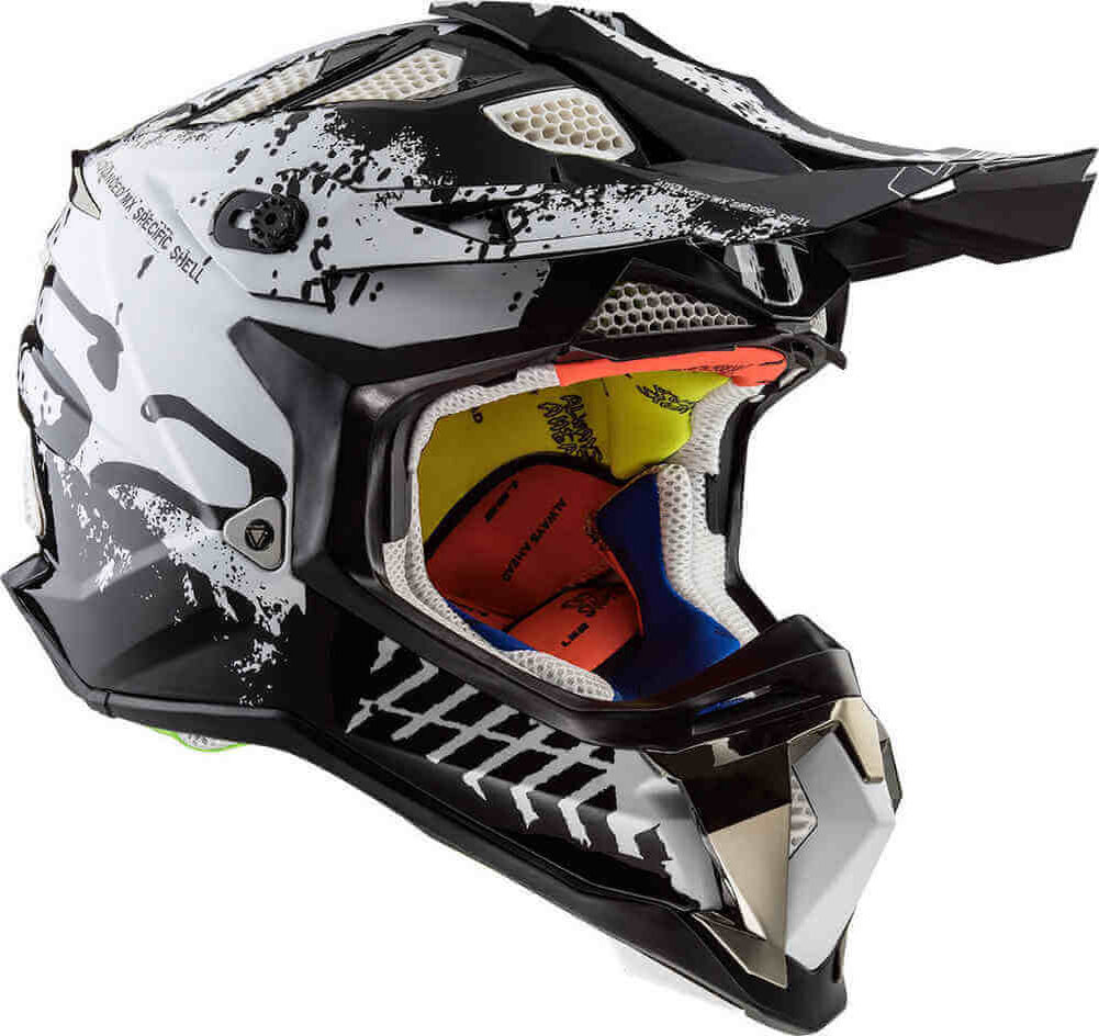 Самое важное снаряжение, которое может носить гонщик мотокросса, — это правильно подобранный шлем . Мотокросс шлемы защищают голову и лицо наездника от ударов и предотвращают серьезные травмы. Мотокросс шлемы обычно отличаются от других мотоциклетных шлемов солнцезащитным козырьком, отверстием для защитных очков и дополнительной защитой подбородка. Удлиненная область подбородка обеспечивает дополнительную защиту от камней и другого мусора, веток и камней вылетающих из под колес других гонщиков. Также у многих шлемов снимается подклад, для того чтобы его можно было почистить или помыть после пыльной и грязной дороги. Многие шлемы, а в частности для эндуро гонок, оснащены специальными отверстиями под трубки, для подачи жидкости. Это для того что не терять время для остановки, когда в жаркий день необходимо удалить жажду и восстановить силы.