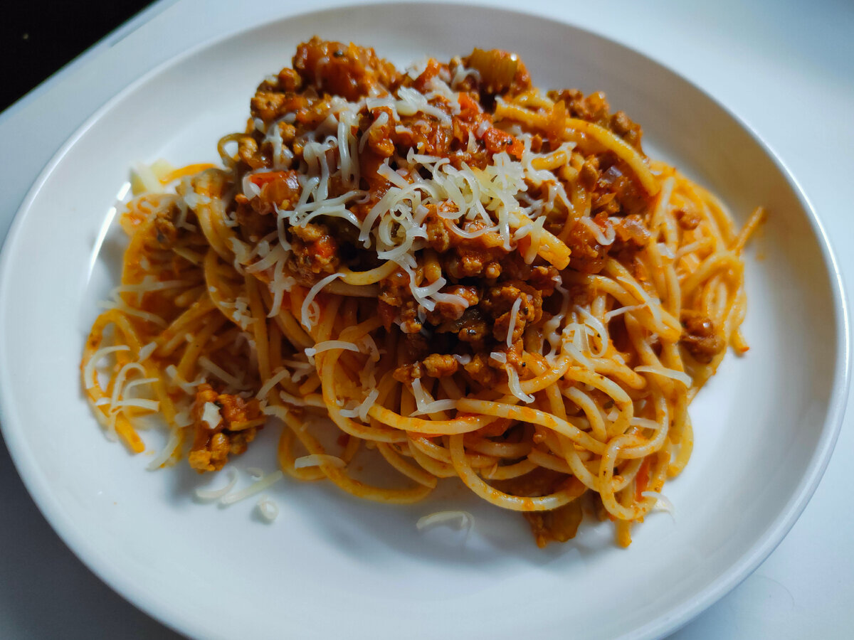 Упрощённая версия популярного итальянского блюда. Ну очень вкусно получается! - фарш 300 г - спагетти 300 г - луковица крупная 1 шт. - морковь крупная 1/2 шт. - сельдерей (стебли) примерно 3 ст.ложки порезанного - чеснок 3-4 зубчика (у меня без него) - сыр желательно твёрдый 40 г (в оригинальном рецепте пармезан) - масло растительное 3-4 ст.ложки - томатная паста 1,5 ст.ложки - томаты свежие или протёртые (по возможности) 1-2 шт. - соль примерно 1 ч.ложка без горки - перец молотый 1/2 ч ложки - итальянские травы, базилик, орегано 1-2 ч.ложки На растительном масле пассеруем лук, чеснок и морковь - до мягкости: Добавляем фарш, разбиваем лопаткой комочки, перемешиваем, обжариваем до изменения цвета фарша: Добавляем сельдерей. Если не любите его - просто опустите этот этап: Добавляем соль, перец, сухие травы. Перемешиваем: Вливаем горячую воду (в оригинальном рецепте используется сухое вино🍷) Столько, чтобы она едва покрыла фарш. Даём закипеть, убавляем до слабого кипения. По желанию
