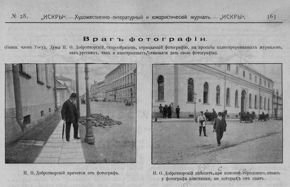 «Бывший член Государственной Думы Н.Ф. Добротворский старообрядец, отрицающий фотографию, на просьбы иллюстрированных журналов, как русских, так и иностранных, отказывался давать свою фотографию». Вот так ни больше, ни меньше написано в журнале «Искры» за 1906 год № 28. И пройти бы мимо этой заметки, мало ли чудаков на земле было, но … никак невозможно. Ибо на страницы журнала попал бывший городской голова г. Оханска. Николай Федорович Добротворский, о котором мы уже читали в группе «ОХАНСК – НАША РОДИНА» https://vk.com/public179839755?w=wall-179839755_1292 несколько лет возглавлял г. Оханск. Информации о нем немного, поэтому сегодняшний рассказ лишь еще немного внесет дополнительных фактов в страничку его биографии. Первый снимок запечатлел почтенного Николая Федоровича стоящим на тротуаре у здания Государственной Думы (в Петербурге). Снимок подписан следующим образом: «Н.Ф. Добротворский прячется от фотографа» Немного комично, для человека с тучной фигурой прятаться за тонким фонарн
