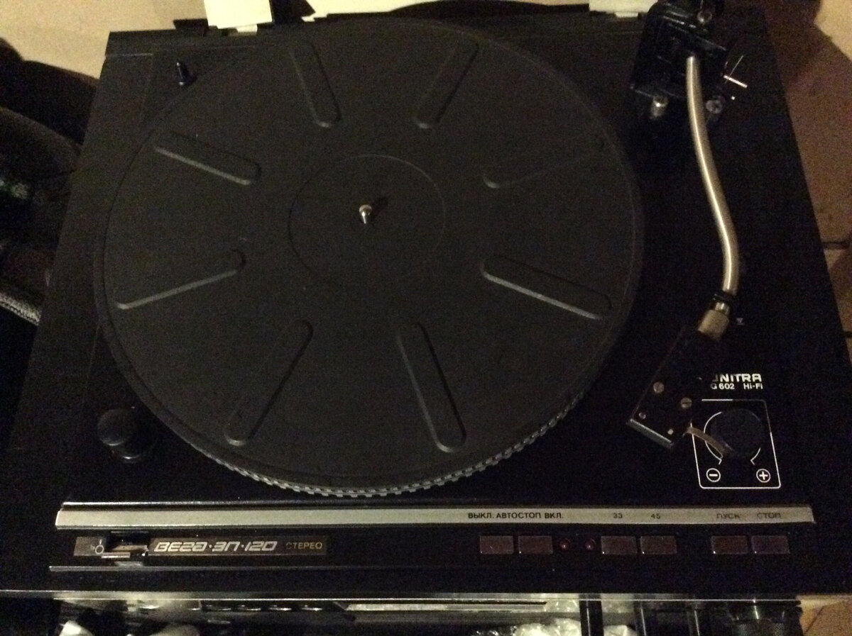 О том , что существует Вега эп 120 я конечно слышал но в чем ее отличие от эп 110 не имел понятия . По виду та же , да и ладно... Что бы «восполнить пробел в эрудиции» на предложение «покрутить в руках и поставить диагноз» согласился — тем более обратился хороший знакомый. И вот ОНА . Близняшка 110-ой по индексу «120» должна быть более поздней моделью ... Черная - редкость конечно но не очень большая , судя по сайту БРЗ были и другие цветовые комбинации. «Высокий» тонарм и тяжелый диск — в общем классическое эпу G602 . Несколько неожиданно для предположительно более поздней модели , однако после знакомства с Вега 50ас 106-2 где вместо одного большого басовика два маленьких — не удивляюсь продукции БРЗ. Корпус , сама станина из толстой фанеры - на поздних версиях эп 110 пластмассовый . В общем все очень хорошо : тяжелый корпус , тяжелый диск — все по аудио-феньшую для вертушек . Общий вес с учетом тяжелого диска килограмм 11,5. Хорошая покупка для начала похода в хай-фай , впол