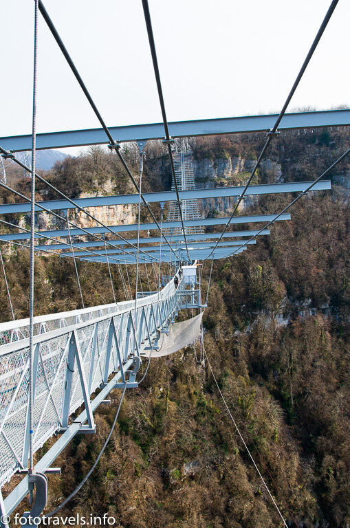 Да, это подвесной (без опор) мост, с полом из решетчатого пластика и при небольших порывах ветра вся конструкция подозрительно всхлипывает и ощутимо раскачивается. Вместе с тем поручни достаточно высокие и упасть вниз, если на то нет желания или без посторонней помощи просто невозможно.