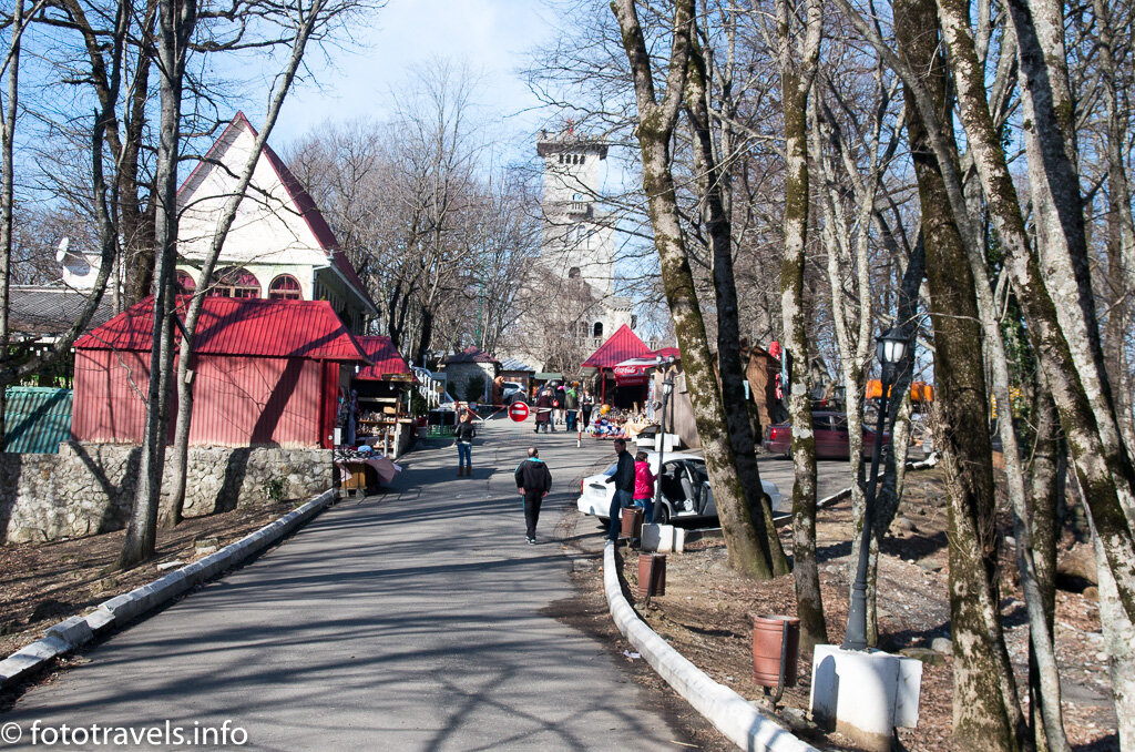 На вершине оставляем машину на стоянке и идем к башне. На самом верху этой постройки устроена смотровая площадка, билет на которую обойдется в 100 рублей за человека. Подняться на башню стоит обязательно, так как оттуда открывается прекрасный вид и на Большой Кавказский хребет и на побережье.