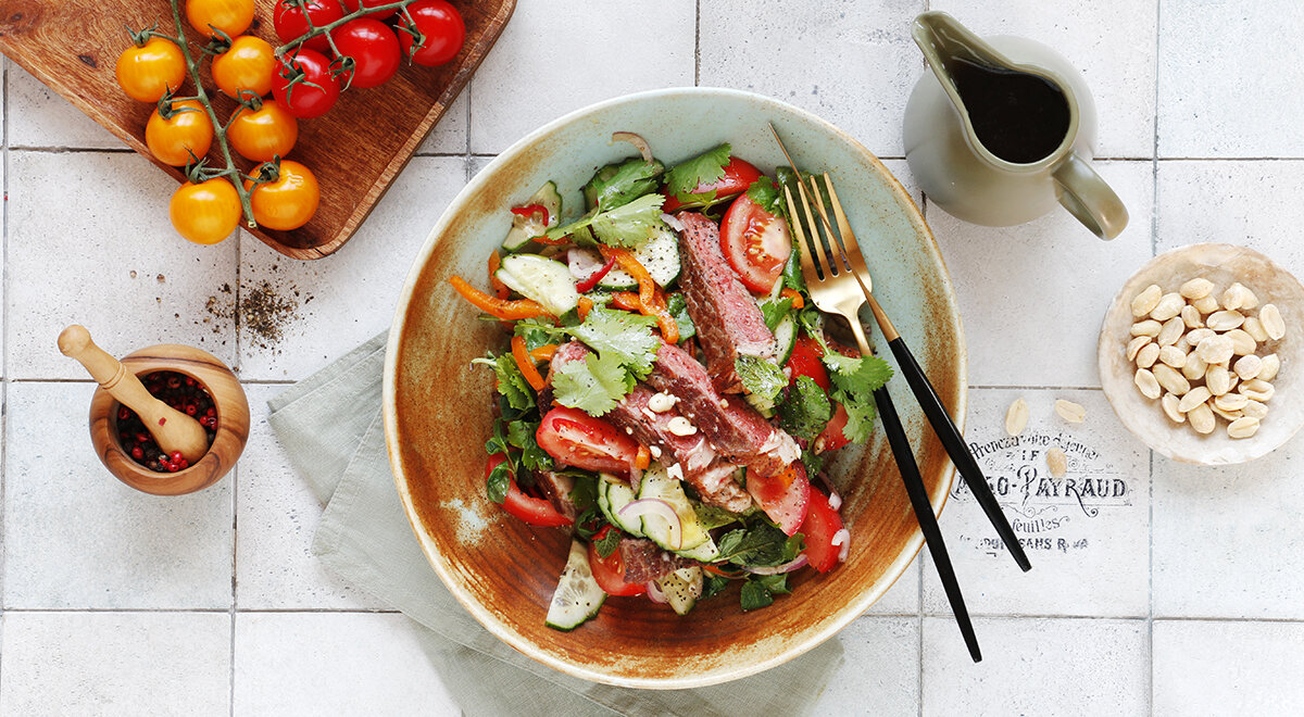 Стоит уделить внимание главному ингредиенту этого блюда - говядине. В первую очередь нужно проверить кусок на свежесть. Доброкачественное мясо имеет цвет спелой малины, блестящую поверхность и приятный запах. Надавите на него пальцем. Если ямка мгновенно не исчезла, то такое мясо брать не стоит. Чтобы говядина стала мягкой, нежной, а не резиновой, важно ее правильно приготовить. Существует два способа. Подробнее о них читайте здесь ⬇️ https://www.gastronom.ru/recipe/56432/salat-s-govjadinoj-i-bolgarskim-percem ИНГРЕДИЕНТЫ: стейки из говядины – 350 г помидоры – 2 шт. болгарский перец – 1 шт. огурец – 1 шт. красный лук – 1 шт. мята – 3 веточки кинза – 3 веточки перец чили – 0,5 шт. арахис – 40 г оливковое масло – 30 мл черный молотый перец – 5 г соль – 5 г Для заправки: оливковое масло – 20 мл кунжутное масло – 20 мл лимонный сок – 50 мл сахар – 15 г ПОШАГОВОЕ ПРИГОТОВЛЕНИЕ 👍 ХОЗЯЙКЕ НА ЗАМЕТКУ Стейк из говядины для салата должен быть комнатной тем