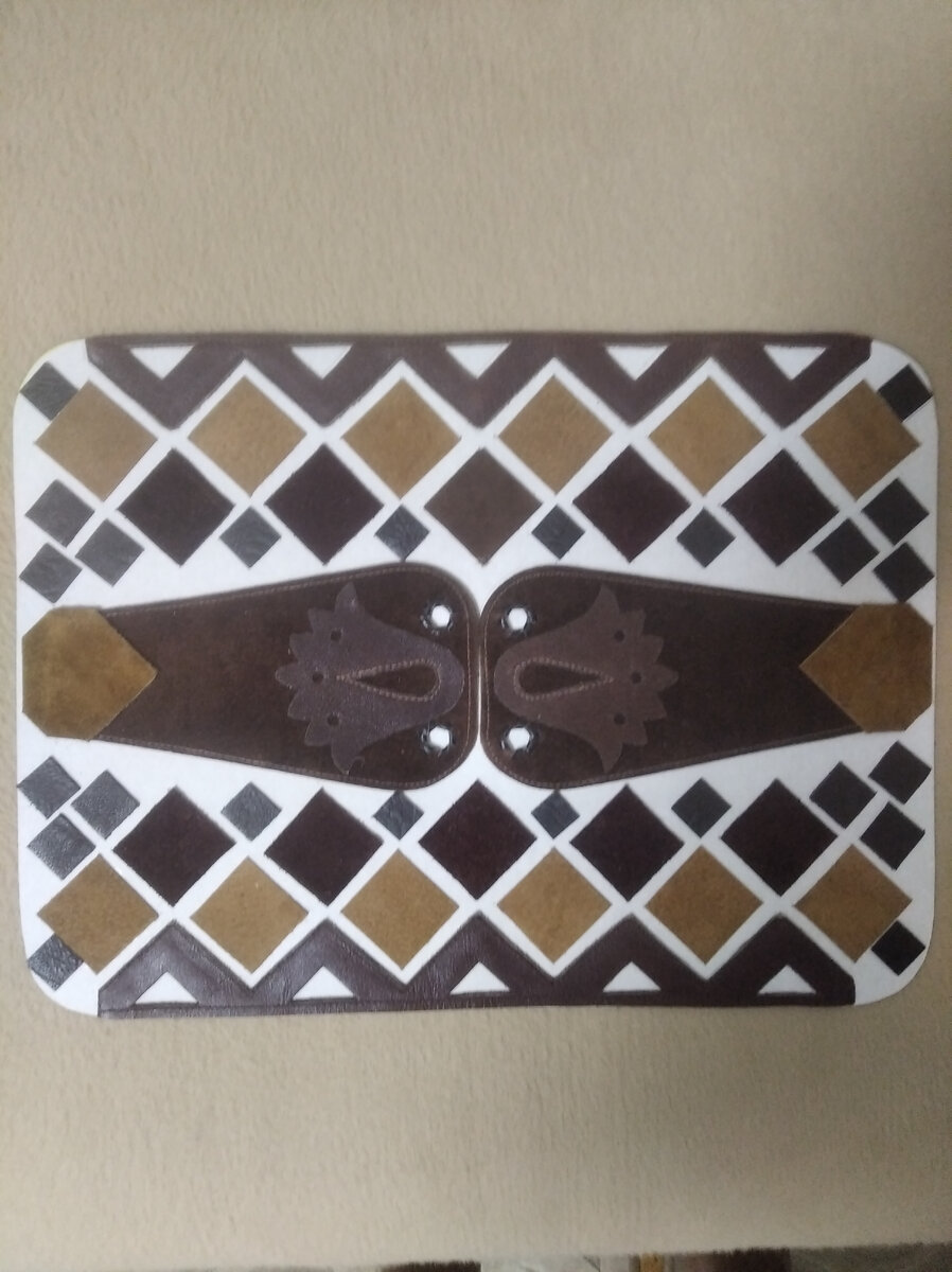 Вот и закончила я две последние крышки (из четырех-о первых двух крышках смотрите предыдущую статью, часть 4) на корзины, которые стоят у меня на полке над окном, причем последняя сделана из совсем маленьких остатков. Более крупные получились там, где использовала остатки от замшевого пояса (в центре) и украшения в виде ленты треугольников от сапог по горизонтали (вверху и внизу). Отсюда и пошли квадраты для заполнения остальной площади крышки. А уж из того, что осталось, сделала последнюю крышку. В центре использовала треугольники, полученные при обрезке вот таких элементов для оформления (об этом в следующей работе). Остальное пространство заполнила треугольниками из остатков кожи, которые были уже нарезаны заранее. Если в первом случае элементы наклеены симметрично, то здесь я не соблюдала это правило. Из всего, что осталось, трудно это сделать. Но подбирала треугольники так, чтобы они смотрелись нормально в общей картине. Вот такие получились последние крышки. А как я довольна,