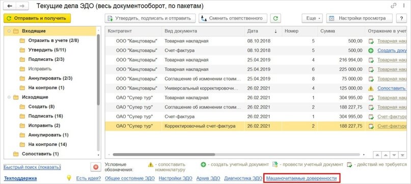 Машиночитаемая доверенность – это электронная доверенность в формате XML, подписанная усиленной квалифицированной электронной подписью доверителя. Все машиночитаемые доверенности хранятся в системе в специальных справочниках: машиночитаемые доверенности организаций; машиночитаемые доверенности контрагентов. Доверенности попадают в эти справочники разными способами: