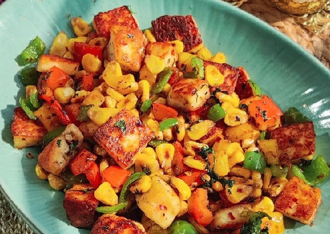 Ингредиенты: панир, кукуруза, болгарский перец, хлопья чили, чат масала, масло гхи, кинза, соль, белый нут, лук, помидор, кумин, молотый чили, лимонный сок, зеленый свежий чили, оливковое масло Салат из кукурузы и панира Время приготовления: 10 мин.