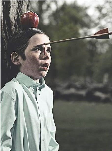Многие видели эту картинку, но далеко не каждый знает ее историю. В 1985 году 13-летний Тайлер Керк (герой фотографии) прошел кастинг на съемку в рекламе шоколадной пасты Nutella. Это был довольно типичный ролик, где по сюжету мальчик сидит во дворе своего дома и печально грызёт яблоко. Далее по сценарию из магазина возвращаются родители, демонстрируя ребёнку банку "Nutella",а тот радостно бежит намазывать бутерброды. На съёмочной площадке стояла огромная корзина с красными яблоками, -запас для неудачных дублей. Получилось так, что действие с яблоком сняли со второй попытки, и вся корзина оказалась в распоряжении съёмочной группы. Рекламщики-народ творческий, и просто съесть гору яблок им показалось скучным. Где-то в соседней студии они нашли спортивный лук и начали расстреливать яблоки. Среди фотографов был некий Джейсон Аддерли, который в колледже профессионально занимался стрельбой из лука. У него родилась идея фото-сюжета, состоящая из двух частей. Лицо человека с яблоком на голове