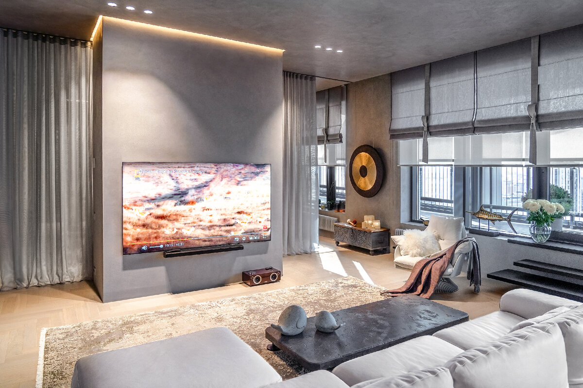 Цвет и свет, текстуры и линии мебели — всё говорит о спокойствии и гармонии. Над созданием интерьера работала сама хозяйка, и каждая вещь в этом жилище не случайна. Предметы поддерживают философию и стиль жизни хозяев. Задачей дизайнера Togas Couture в этом проекте было продумать его текстильное оформление, которое стало бы продолжением общей концепции гармоничного спокойствия и легкости. Именно поэтому квартира наполнена воздушными тканями и полупрозрачными тюлями. Пространство в этом проекте спланировано как общая зона кухни-гостиной и комнаты для каждого члена семьи. Декораторским приёмом для создания необходимой воздушности стал переход от светлого к тёмному цвету штор и от более плотной к прозрачной ткани. Для оформления гостиной использовалось сочетание рулонных штор из полупрозрачной вуали и римских из двухслойного тюля в тон стен, с оригинальными шёлковыми бантами. Спортивную зону от основной гостиной отделили дымчатым тюлем, который создает приватность для занятий йогой. В спа