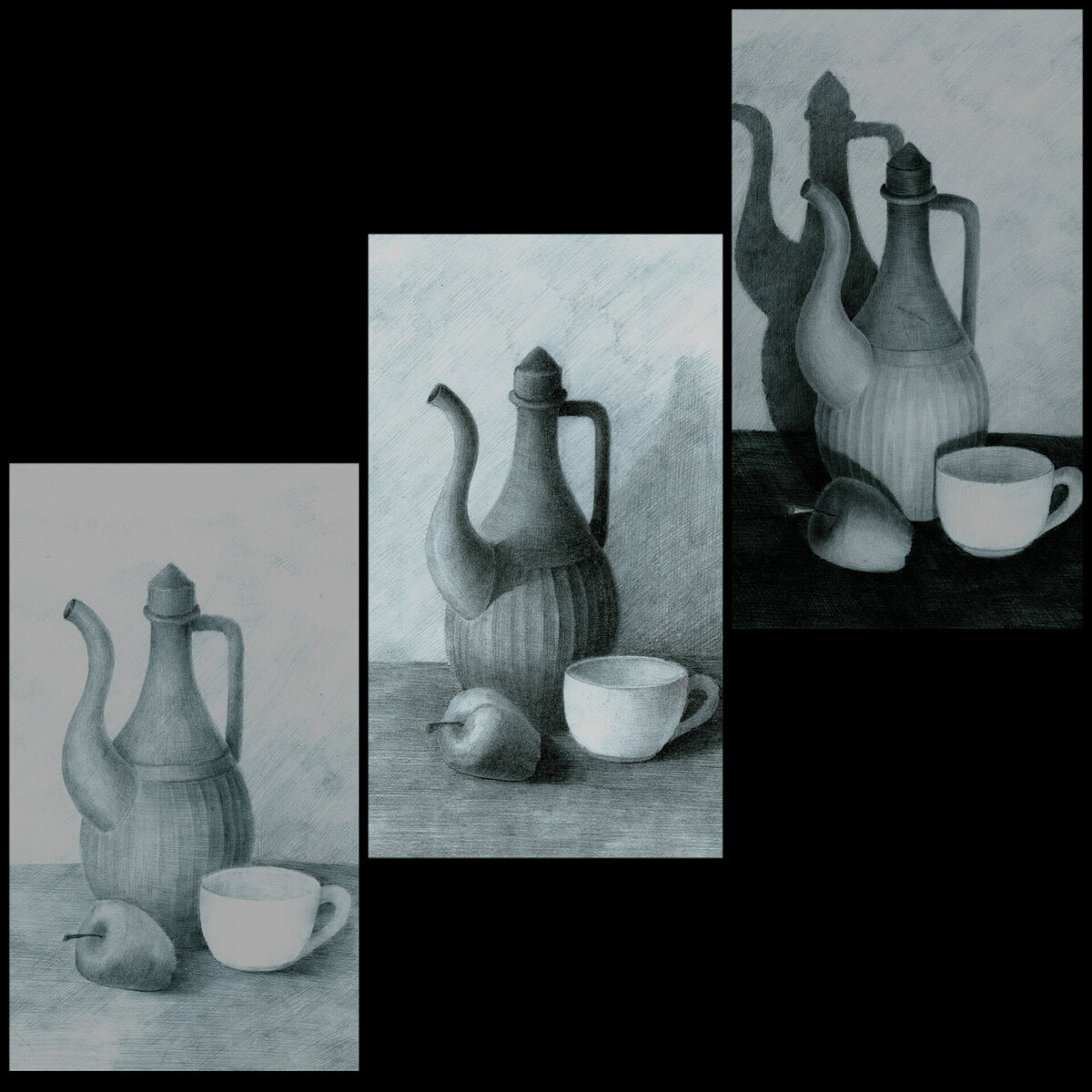 Без света нет образа. Свет не только подчеркивает формы и озаряет пространство, но и влияет на настроение работы. Многие художники делали основной акцент на достижение темы путем передачи освещенности. Натюрморт №1 «Натюрморт с яблоком» выполнен при искусственном освещении, но подобное впечатление производит и свет, проникающий сквозь окно поздним утром. По положению теней и бликов можно сказать, что источник света находится слева. Кроме того, тени короткие и нечеткие. Это означает, что свет рассеянный, нежели сфокусированный. Такое освещение подойдет, если нужно выполнить точный рисунок. Освещение четко передает формы, подчеркивая их. Можно обратить внимание, что из за отсутствия теней, объединяющих формы, пространство во многом определяет общий вид рисунка. Лампа расположена с левой стороны стола. Первое, что бросается в глаза, — перемена настроения. Длинные падающие тени придают предметам таинственный вид, а темные участки справа будоражат воображение. Цвета по сравнению с исход
