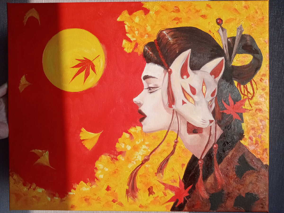 Всем привет. Наконец доделала свою вторую работу из серии "Лица в масках". Как по мне, эта работа получилась чуть-чуть удачнее. Тёплые цвета и колорит древней японии - это то, чего недостаёт первой картине. В этой серии осталась ещё одна работа. Очень надеюсь, что она будет нарисована в этом месяце.